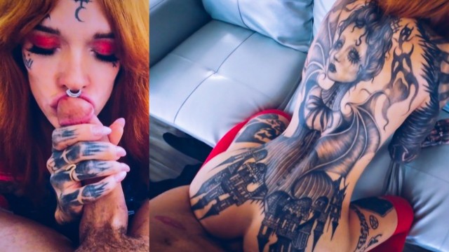 Tattooed brunette shemale gives POV blowjob - Treat by Domino Presley